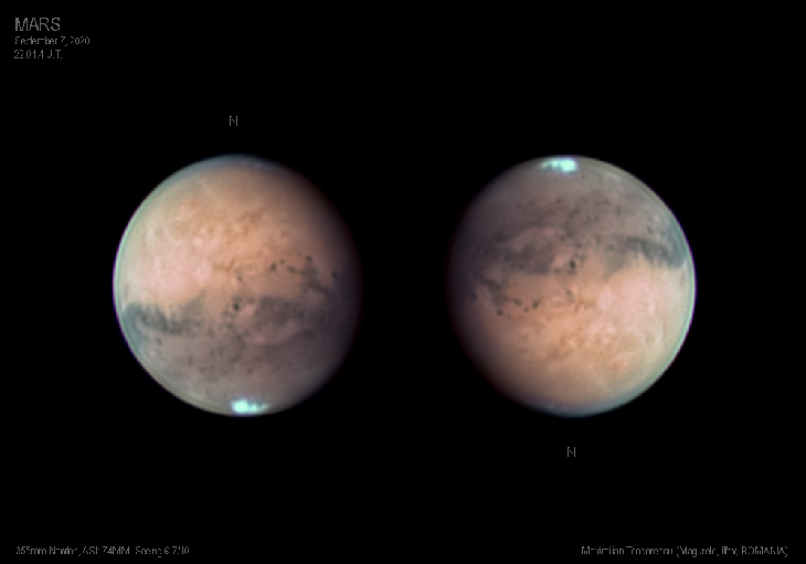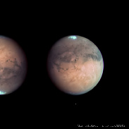 Mars is getting really big now, close to its maximum size for this opposition. At the moment it is around 20 arcsec, which allows for moderate to large scopes to detect some craters in the 150 km size. The Eye of Mars, Solis Lacus, stands well in this view. The polar cap is fragmented. This is an near infrared view combined with RGB data. Note the clouds in the north polar area.