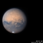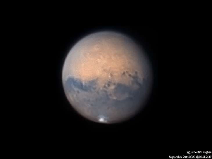 Mars on September 20th. Seeing was slightly above average with excellent transparency. Olympus Mons is the bright spot at 11:00 with Tharsis and its three volcanoes also visible. The large canyon Valles Marineris (Mariner Valley) is dark area between surface features Melas Lacus and Nectar at 3:00. Below Valles Marineris is Solis Lacus also known as "The Eye of Mars" with the surrounding light area of Thaumasia. Mare Sirenum is the dark surface feature at 9:00.Meade 12" LX200 GPS, ZWO ASI174MM