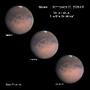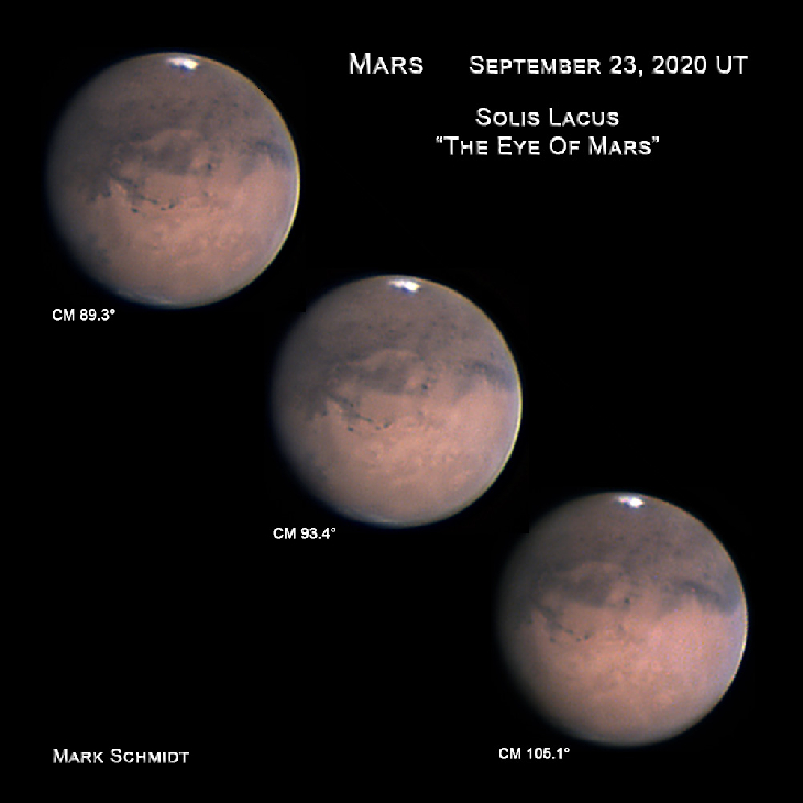 Mars is quickly approaching earth and will be arriving for its closest approach on October 6, 2020. On the night of September 23, 2020 the seeing conditions were rather dismal but they rapidly improved so I took a look at Mars. Mars was looking back at me! Solis Lacus (The Eye of Mars) was the prominent feature visible. I took some photos and put together a composite image that represents what I saw. I used a Celestron 14” SCT and a ZWO ASI290MC camera. South is up on all images as per the Association of Lunar and Planetary Observers’ standard.