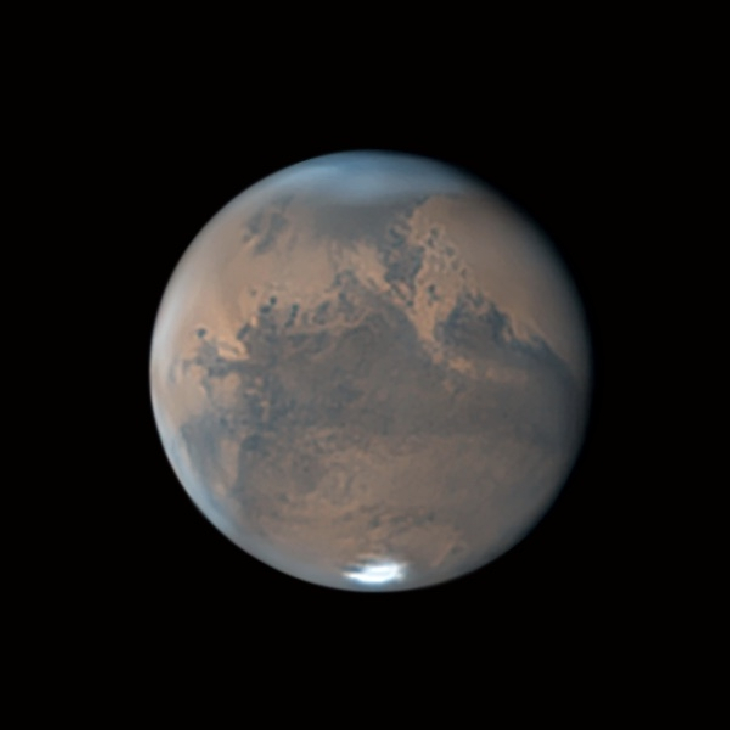 Mars is getting brighter and closer, many details are seen in the image, especially the blue clouds covering the north pole of the planet.