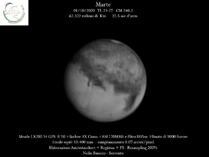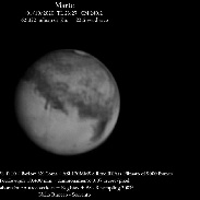Ancora un'immagine del pianeta rosso in IR ripreso ieri sera intorno alle 23.30 quando ancora non aveva raggiunto il meridiano e prima che sopraggiungessero le nuvole. In primo piano il Mare Cimmerium, la Syrtis Minor e a seguire la Syrtis Major che sorge.