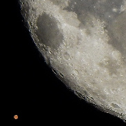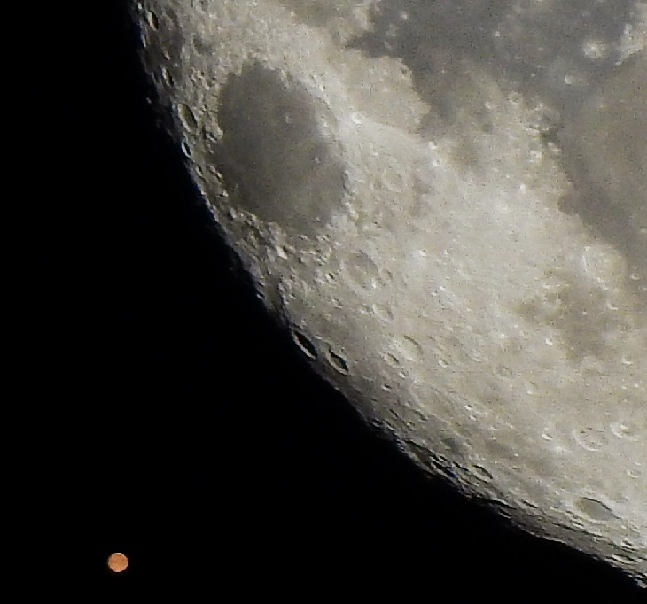 The photos show the Moon-Mars conjunction. A Nikon CoolPix P900 camera was used to take them around 01:26 (UTC-3h) with no attachment to a telescope. By very little the close encounter failed to become a grazing occultation with only 4 arcminutes separating Mars from the lunar limb.