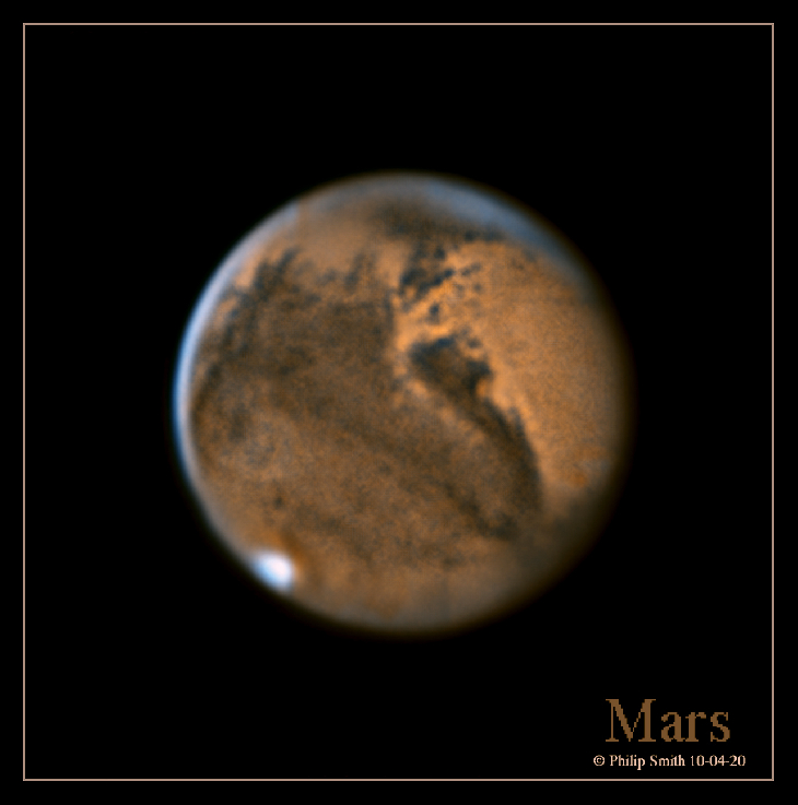 I imaged Mars from my backyard observatory in Manorville, NY USA on 10-04-20. Using the IR(G)B technique for coloring this image. I leaned this from a Damian Peach's Astrophotography tutorials on his patreon channel that I became a Gold Member for $10.00 US a month so I can unlock everything on his page. He said this method is especially beneficial when seeing conditions are not great, or for those using large aperture telescopes (40cm or more.) He also said it is best to us your RGB filters when seeing is GOOD. I have a lot to learn. Seeing was poor at the time with slite winds and a 16.82 Day Old Moon close to Mars. I used a IR-742 Filter and a Blue Astrodon Filter then made a copy of the IR-742 (650nm) Filter and pasted the Blue filter to the IR-742 copy to make the synthetic Green file image. Then go to layers and opacity down to 50% then merge is your synthetic Green File. Then you need to merge all 3 files to get your color image. My setup was Edge HD14" / ZWO asi290mm camera 2 Filters used IR-742 (650nm) Filter and a Blue Astrodon Filter. ZWO adc atmospheric dispersion corrector / ZWO 8 position filter wheel in a 2X barlow. All guided with an 1600GTO German Equatorial Mount, I hope to share with you more more Mars images. I am praying for GOOD Seeing that is hard to come by. So tell me what you think in the comments.Kind regards to ALL!