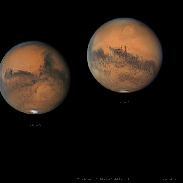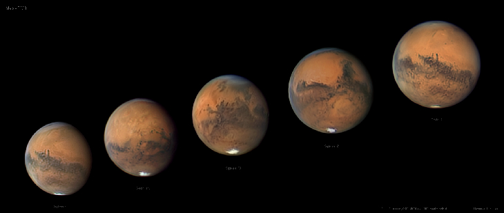 A five image compilation showing the size evolution of Mars in one month as it approached Earth. Size increase from 19 to 22.5 arcsec. Details on image.