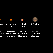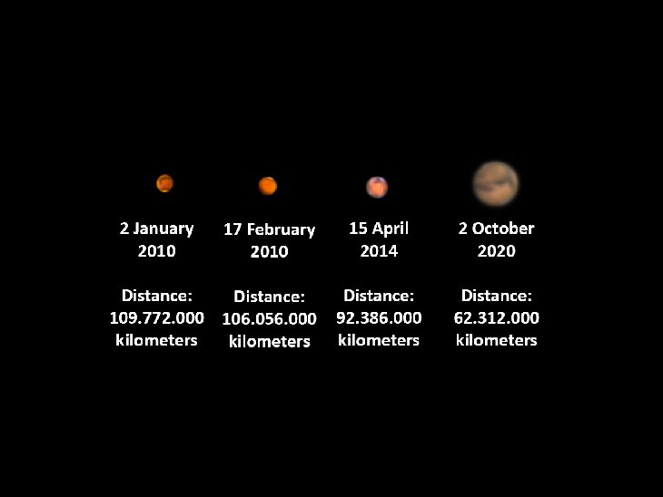 I photographed the planet Mars on several occasions and combined the pictures to show the apparent size related to it's distance from Earth. Photo's were taken with a SkyWatcher 130/900. First 3 picture with Philips ToUCam and the last one with a ZWO ASI 120 MC-s