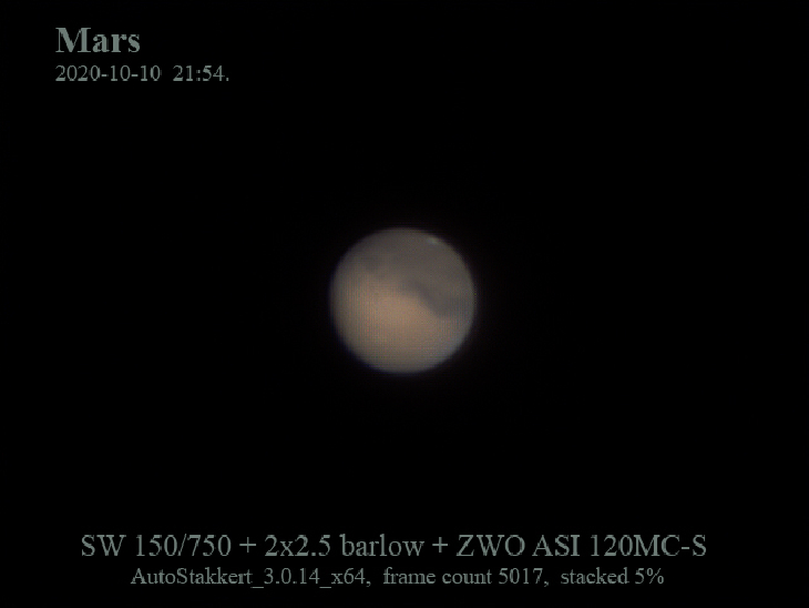 Mars recorded through the telescope 150/700 SW with two 2.5 Barlow lens.