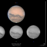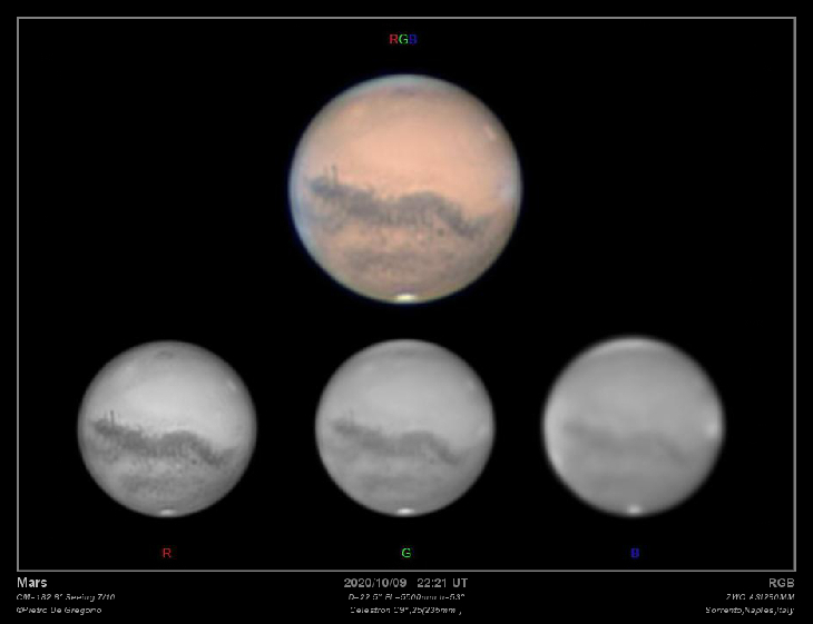 The red planet a few days before the opposition shows many details in this image.The Cimmerium sea with the imposing Elysium volcanic region is giving way to the Sirenum sea with the Nix Olimpica the highest volcano in the solar system. very small now and the mists in the north with the cloudiness at the edges of the planet are the background in a show of colors, the details are as always on the image