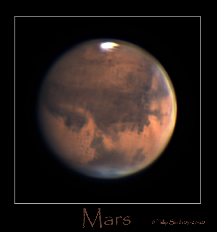 I imaged Mars on 9-27-20 from my backyard in Manorville NY, USA from my observatory. See was above average but I had to image threw a thin layer of clouds. Setup was Zwo ASI224MC "COLOR" camera in a ZWO ADC, "Atmospheric Dispersion Corrector", it reduces prismatic smearing during planetary imaging, resulting in images with finer details and with Baader IR/UV cut Filter and a 2X barlow on an Edge HD14". I have a lot to learn on how to process planetary images. I just want to get good data files now and I can always go back and reprocess my files as I get better processing and learn how to use all the processing software to get more detail. GOOD Seeing and GOOD Collimation is a GOOD Start 🙂 Kind Regards To ALL.
