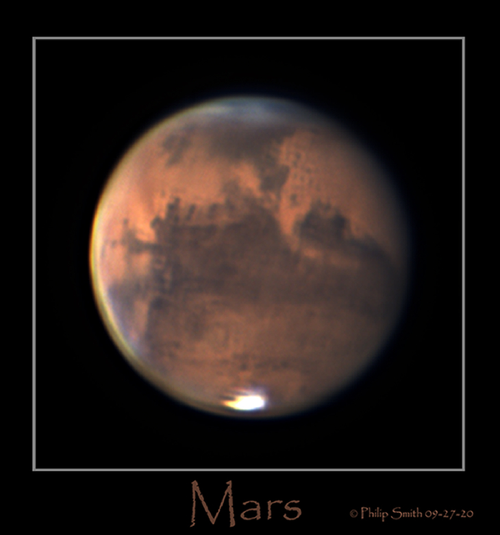 I imaged Mars on 9-27-20 from my backyard in Manorville NY, USA from my observatory. See was above average but I had to image threw a thin layer of clouds. Setup was Zwo ASI224MC "COLOR" camera in a ZWO ADC, "Atmospheric Dispersion Corrector", it reduces prismatic smearing during planetary imaging, resulting in images with finer details and with Baader IR/UV cut Filter and a 2X barlow on an Edge HD14". I have a lot to learn on how to process planetary images. I just want to get good data files now and I can always go back and reprocess my files as I get better processing and learn how to use all the processing software to get more detail. GOOD Seeing and GOOD Collimation is a GOOD Start 🙂 Kind Regards To ALL.