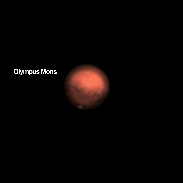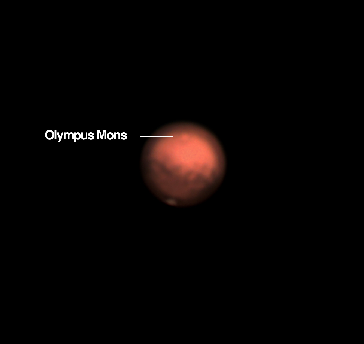 Planet Mars taken with SkyWatcher Maksutov - Cassgrain 127/1500 mm, Barlow 2x, ASI ZW0 2nine4mc. Little pale dot in the northen hemisfere of the planet is Olympus Mons (21km) the biggest planetary mountain in Solar System. Three times bigger than Mount Everest!