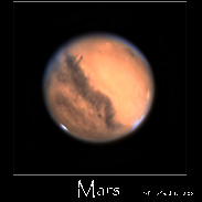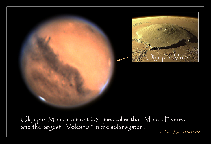 I imaged "Olympus Mons" the largest “ Volcano ” in the solar system on Mars on 10-18-20 from my backyard in Manorville NY, USA. See was average to above average. Setup was a ZWO ASI224MC "COLOR" camera in a ZWO ADC, "Atmospheric Dispersion Corrector", it reduces prismatic smearing during planetary imaging, resulting in images with finer details and with Baader IR/UV cut Filter and a 2X Tele Vue barlow in a MoonLite focuser on an Edge HD 14". This is a little history about "Olympus Mons" Olympus Mons (Latin for Mount Olympus) is a very large shield volcano on the planet Mars. By one measure, it has a height of nearly 22 km (13.6 mi or 72,000 ft.) Olympus Mons stands about two and a half times as tall as Mount Everest's height above sea level. It is the tallest mountain of all planets and other rounded bodies in the Solar System, and is the second tallest mountain in the Solar System overall, after Rheasilvia on the Asteroid Vesta. It is the youngest of the large volcanoes on Mars, having formed during Mars's Hesperian Period. It is currently the largest volcano discovered in the Solar System and had been known to astronomers since the late 19th century as the albedo feature Nix Olympica (Latin for "Olympic Snow"). Its mountainous nature was suspected well before space probes confirmed its identity as a mountain. The volcano is located in Mars's western hemisphere at approximately 18.65°N 226.2°E, just off the northwestern edge of the Tharsis bulge. The western portion of the volcano lies in the Amazonis quadrangle (MC-8) and the central and eastern portions in the adjoining Tharsis quadrangle (MC-9).
