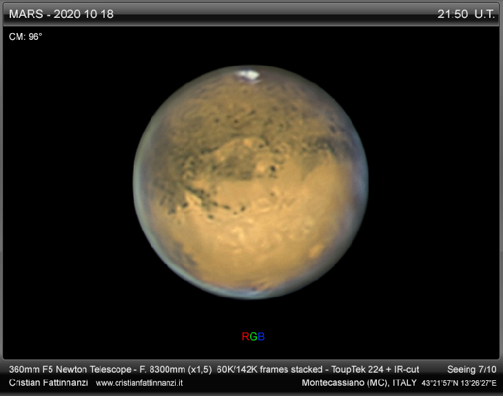 Finally a good evening with a stable atmosphere on October 18th. I tried to use the 36cm diameter Newtonian telescope to capture the maximum possible on the surface of Mars. The eye of Mars "Solis Lacus", dark right in the center of the image. The south pole evidently tripartite, in the lower right the Mount Olympus on which the sun rises and many blue clouds at the edges.