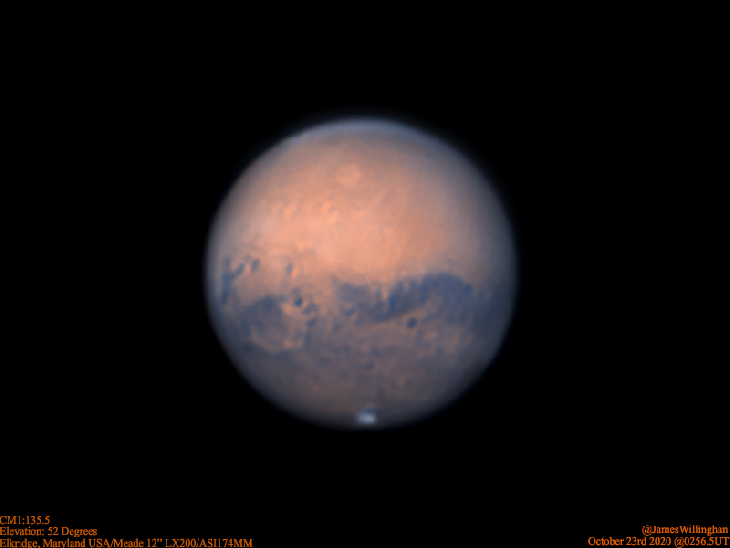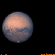 Mars on October 23rd seeing was much better being slightly above average with average transparency to start which gradually worsened during the session. Still lots of dew to deal with. North is up and East is on the right in the image. Mare Sirenum is the prominent dark surface feature across the middle with Solis Lacus (The Eye of Mars) at 8 o'clock. Visible in this image at 9 o'clock just rotating out of view is Valles Marineris (Mariner Valley). Olympus Mons is visible in the north almost center. Not many clouds visible over Tharsis and the Tharsis volcanoes as on the 22nd. Clouds are also visible along the eastern and northern borders. Meade 12" LX200, ZWO ASI174MM