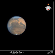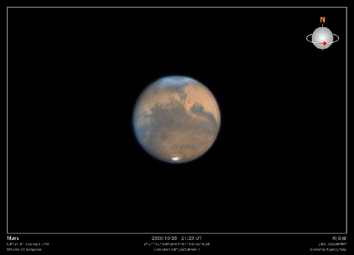 There was a continuous passage of clouds in this Mars session, so I used the R (G) B technique with the synthetic green channel to get at least one video of the red planet, and the result seems very satisfactory to me. Many are details imprinted in this image, I mention only a few more common as the Erythraerum sea in the center to go to the Sinus Sabaeus and Sinus Meridiani on the right and finally move to the north polar region where a spectacular complex of blue clouds stops on the Acidalium sea,details as always are on the image