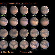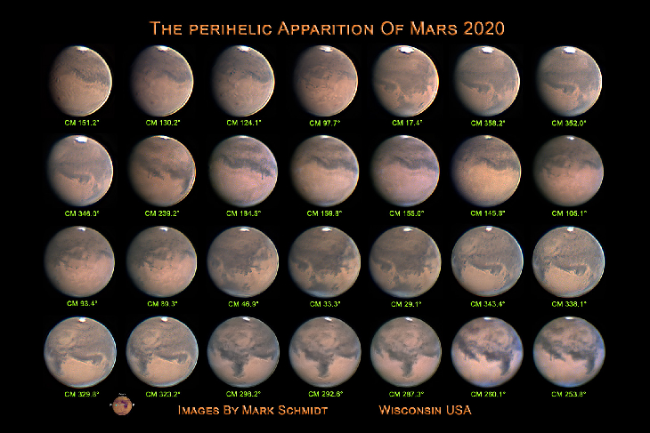 I’ve been imaging Mars on a continual basis from July 2020 to just prior to opposition on October 13, 2020. Ever since Mars reached opposition I’ve had to deal with continuous clouds and rain. The seasonal bad weather came a little early this year. It has now been over two weeks since I’ve been able to image Mars. In an effort to stave off the possibility of “Mars withdrawal symptoms”, I decided to put together a few composite image presentations of Mars. This third image presentation begins in July and continues thru opposition in October. The individual images were selected to represent a minimum of one complete rotation of Mars. The designation “CM” followed by a number in degrees written under each image stands for Central Meridian and is the same as “degrees longitude” on earth.