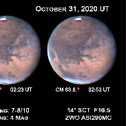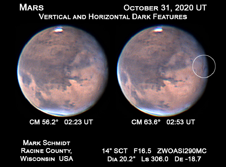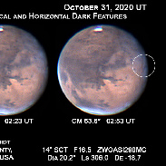 After 20 days of clouds, rain and poor seeing conditions I finally had a clear night to image Mars again. When I completed my imaging session, I immediately started to process the images. I had no Idea about the treat I was in for but getting a treat was fitting considering it was the early hours of Halloween. A mystery dark feature near one of the Martian volcanoes was first brought to our attention by Max Teodorescu of Magurele, Ilfov, Romania a little over a week ago. The dark feature that appeared on his images acquired on October 22, 2020, now seems to have a companion. Both features are near Arsia Mons (a shield volcano), but the newest dark feature is perpendicular to the original one. Its length is in a north-south direction. It will be interesting to find out what these features are. Here are two composite images that show these features. The features are circled on one of the images.