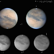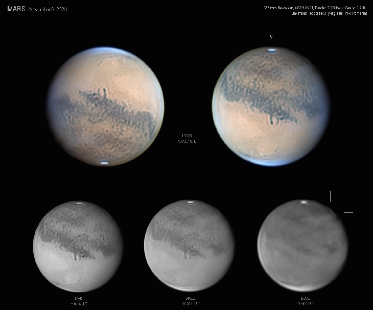 Planet Mars on November 8, 2020. Good seeing for this session. A high altitude cloud is visible on the terminator; it is marked in the Blue filter image, but it is visible in all three filters. Lots of have/clouds on the entire planet.
