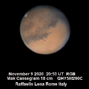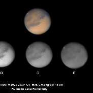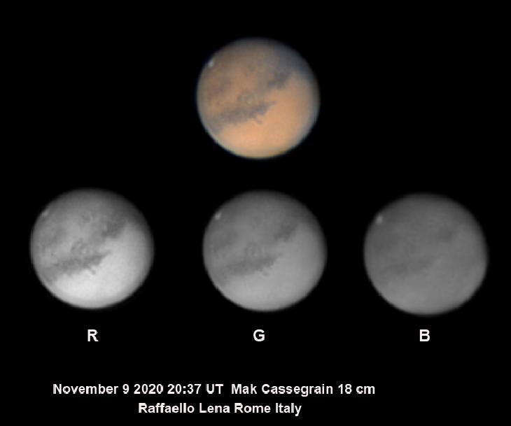 My last image of Mars in pure RGB, including single channels - This image is processed in natural way without any strong application of wavelet filters. Another image of high focal is included. November 9 2020- clouds on the limb of the planet