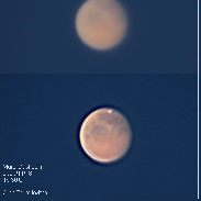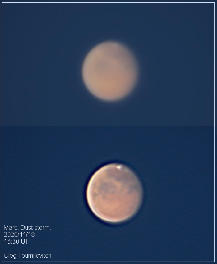 With the Sun still above horizon Mars was difficult to spot through the finder scope. Half of an hour later clouds obstructed the view completely. Developing in the region of Aurorae Sinus dust storm is clearly visible.
