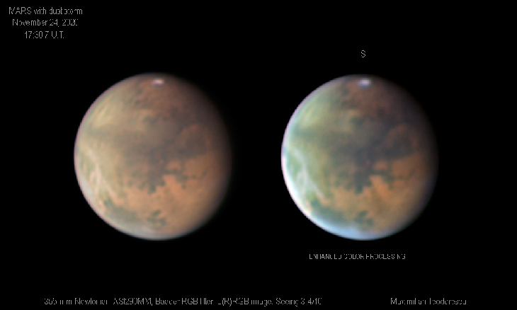 Mars on November 24, 2020. The extent of the dust storm is apparent now, as most of the area East (left) of Solis Lacus is covered with dust. I have also included a strongly enhanced color processing for better contrast of the dust; basically everything that has a greenish tint is dust.