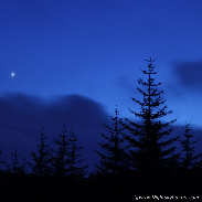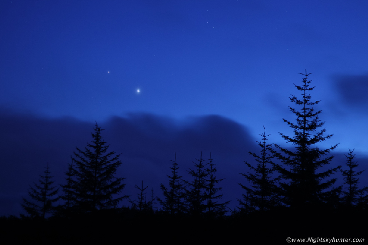 Jupiter and Saturn approximately two degrees apart. They looked a beautiful sight over the trees at Glenshane Pass in N. Ireland during dusk which made for a very festive sky scene. I wonder will the close conjunction on Dec 21st be christened the Christmas Star?