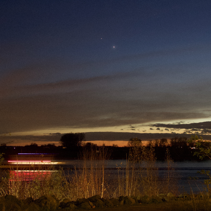 Jupiter (right) and Saturn (left) shine in twilight on December 5th, 2020 over the Rhine near Emmerich. They were good in the southwest evening sky to observe. Both planets Jupiter and Saturn are approaching in the coming days. Observation with clear views is particularly worthwhile at this time of the year. The optical impression of a double star is created. The celestial event will culminate on December 21, 2020 because then there is a great conjunction. The giant planet Jupiter pulls slower at a distance of only 0 ° 06` to the south Saturn over. This rare celestial phenomenon is the faster orbit of Jupiter to owe the sun. There was also such a great conjunction at the birth of Jesus Christ. Scientists and theologians suspect that it is the Star of Bethlehem acted.