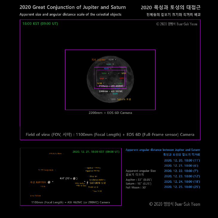 On Dec. 21st, the Jupiter and Saturn will lie just 0.1 degrees(1/5 the diameter of the Moon) apart. 2020 Great Conjunction of Saturn and Jupiter is the closest these planets will appear in the sky since 1623. A much better close conjunction occurred nearly 800 years ago on 1226 with an astonishingly close separation of only 2 arc-minutes(1/15 the Moon’s diameter). After 2020, the next great conjunction will occur on 2080 (0.1 degrees, 1/5 the diameter of the Moon).