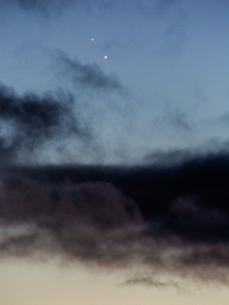 This photo shows Jupiter and Saturn separated by only 15 arcminutes. Three of Jupiter's moons are also visible here: Europa, Ganymede and Callisto.