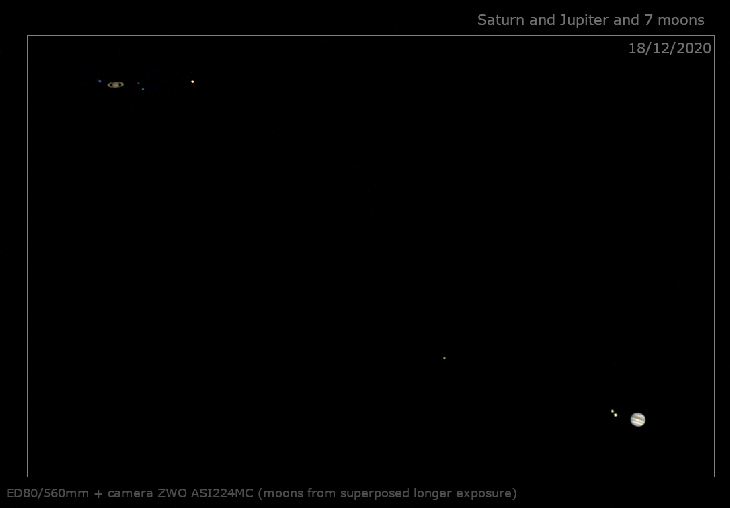 3 days before the great conjunction of Jupiter and Saturn: image obtained last Friday 18/12 in the same camera field of view showing the 2 planets with 7 of their moons (from left to right: Thetis, Dione, Rhea and Titan around Saturn, Callisto, Io and Ganymede around Jupiter).