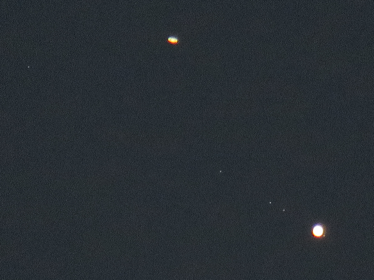 Went up to the roof to photograph the Great Conjunction, just like I did the day before, but this time the weather was much better. Saturn's rings were visible, as were Jupiter's four large moons. The faint star to the far left in the first uploaded image seems to be HIP 99314 aka HD 191250, this 7.45 magnitude star may even be occulted by Ganymede on the 21st of December at 00:49 UTC. I probably will miss it, since the weather forecast for Monday is not very promising.