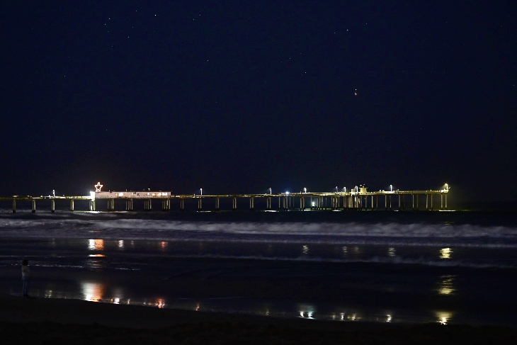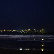 The dancing pair of planets above the Ocean Beach Pier close to setting on the rolling surf of the Pacific Ocean.