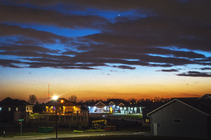 The Jupiter/Saturn conjunction peeks through clouds as seen from Marion, Iowa at 5:32 pm CST, Monday, December 21, 2020. Air temperature was 41 degrees F. 2 second exposure at f/9, ISO 320, 36mm focal length. Nikon D7200 DSLR.