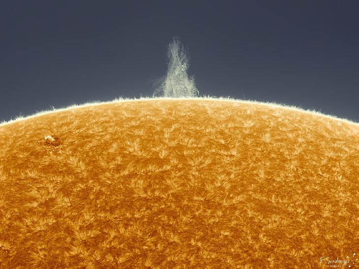 This Monday,February 8, the sun showed a very interesting prominence and very close to that prominence the appearance of a new active zone (to the left of the image). The sky was very cloudy most of the time, allowing me to take pictures at times when the clouds moved a little. Also the seeing was really very bad. Anyway I was able to rescue this image from all the videos that I captured.