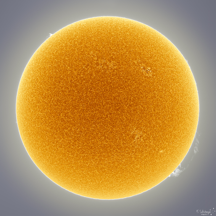 So far this year, the sun has been blank 56% of the time. But a couple of days ago two active regions appeared (AR2804 and AR2805) containing small sunspots. This morning, in this image of the full disk, we can also see a beautiful prominence at the bottom right. Coronado Solarmax II 90 mm single stack telescope and ZWO 183MM camera.