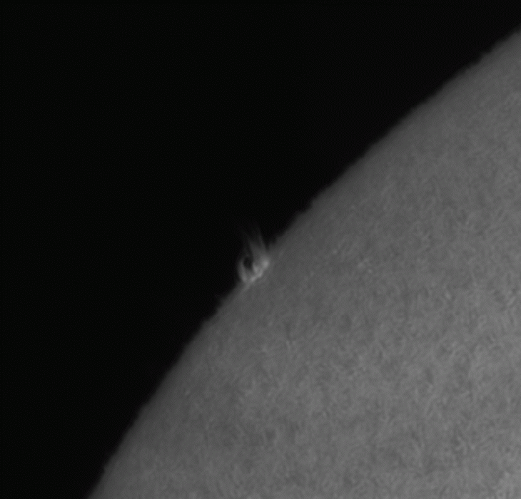 Quite a bit of activity coming around on the NE Limb. The animation was captured from 13:49UT to 14:49UT. Lunt LS60T DS, Skyris 236MM, 120 AVI's captured for the animation.