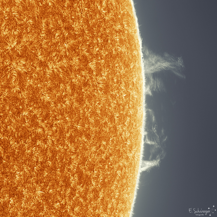 This morning (2:13 p.m. UT) I photographed this interesting prominence. I used a Sky Watcher Esprit 120 telescope with Daystar Quark chromosphere filter and a ZWO 174MM camera