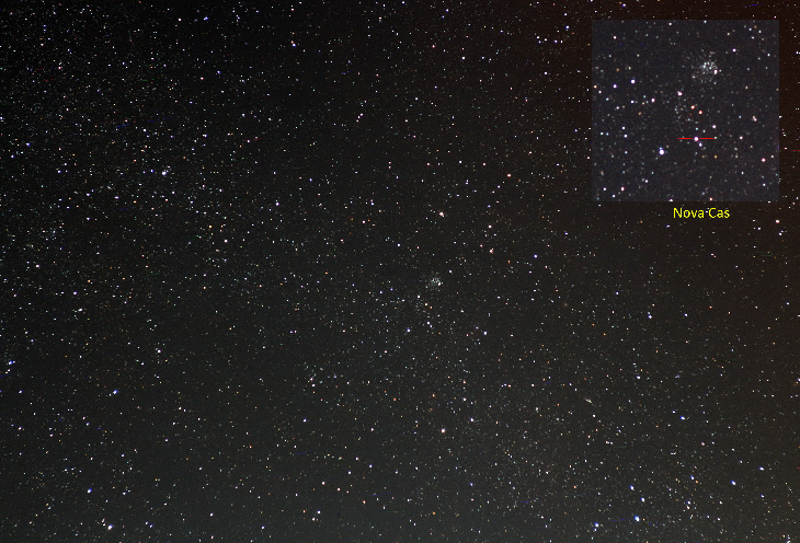 I finally got to process the image of Nova Cas. Nova is also visible through the binoculars near the open star cluster M52. I took photos yesterday in the brightness of the moon before the first quarter. The new flare was discovered by the Japanese Yuji Nakamura on March 18, 2021. At the time of the discovery, it was 9.6 mag. My estimate from the observation is 7.9mag. To the photo: 70x30sec ISO 1600 f / 5.0 focus 135mm. Photographed by Canon EOS 550D + Revuenon 135mm on Omegon Minitrack LX2. 3/20/2021 Palárikovo.