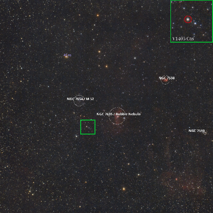 In the light of the recent news about a nova going off in the Cassiopeia constellation, a desire to photograph it appeared. Sadly, weather is not permitting currently in the Republic of Moldova. So I asked my good friend living in California, Tara Mostofi (https://www.flickr.com/photos/84642732@N02/), to shoot it for me and I would take care of processing it. We have very similar setups (same mount and OTA, but different cameras), which means that I would get a similar result. Only 14 proper light frames were collected, but it was enough to create a nice picture and actually capture the nova! It's not our first collaboration project and it feels exciting to know that even bad weather can be overcome. For technical details please check out my Flickr!