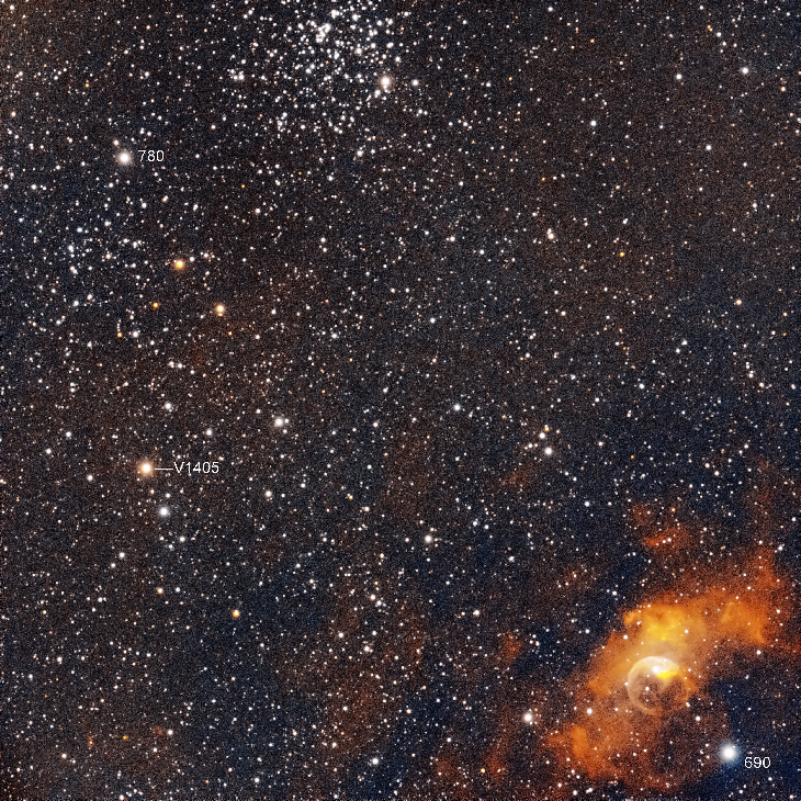 Nova Cassiopeiae 2021 (V1405) April 6th 2021 0030hrs UT Nova V1405 with the open star cluster M52 and NGC7635, the Bubble nebula. Comparison stars are marked, missing out the decimal point for clarity, ie 780 is mag 7.80. This is a stack of 30 x 120sec subs William optics flt132, f/l 925mm asi533mc pro camera, L Enhance filter. CEM 70G mount asi120 mini guide cam, zwo OAG imaging and guiding controlled by asiair pro. processed in pixinsight, finished in photoshop.