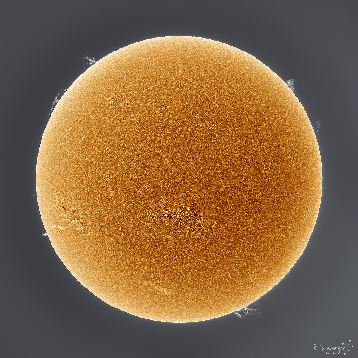 After 20 days of bad weather, today I was able to photograph the sun again, in this image of the complete disk you can see several active regions and also several very photogenic prominences.