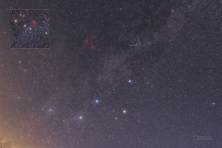 Recently, the night sky offers a pretty unique phenomenon – in the Cassiopeia constellation, a bright nova can be visible on the threshold of naked-eyes visibility away from the cities. Nova brightened first time during March, reaching about 7th magnitude. Now, it gets even to the 5th magnitude. The Nova Cassiopeia 2021, also as V1405 Cas, had been discovered by Czech astronomer Zbyněk Henzl even before its flare. I was lucky to spot the nova just before the daybreak on May 10th, 2021, while cirrus clouds were passing in the view. Still, good enough to capture the constellation with its “new star”, marked by the lines in the image. The inset shows nova just in the center. Used Canon 6D modified, Sigma 50mm, f3.2, ISO 2000, 20x40s from tripod and Vixen U mount.