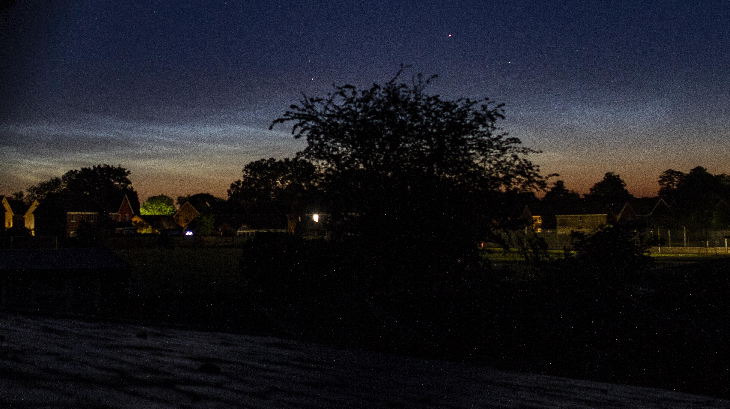 We are further north (52.4029° N, 1.2983° E) in England than Wokingham in a previous post. The NLCs were visible here across the northern sky from 22.30 UTC on a wonderfully clear night. The young crescent moon and Venus were also impressive in the twilight.