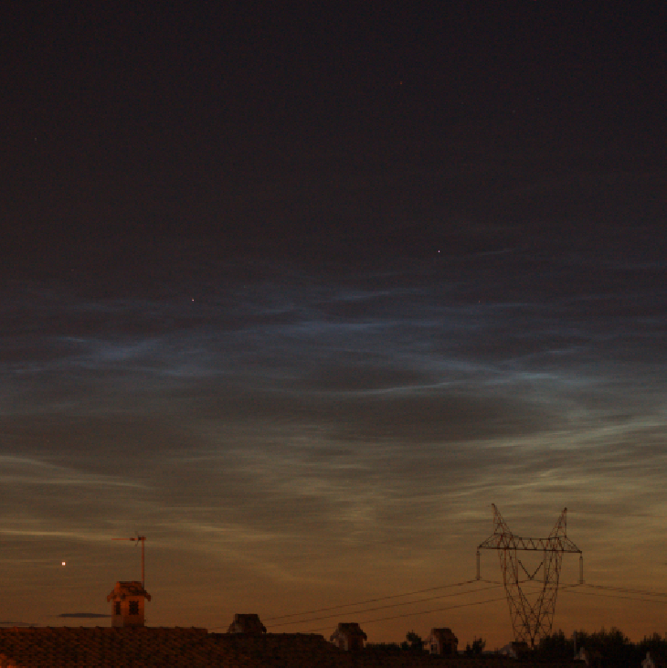 First time I see this (39.6N latitude). The sky was without a single cloud, Venus was fantastic, close to the horizon. And 1 hour after sunset ... these 'ghost' clouds appeared right over Gemini. Can these things be real NLC ? ... really, really beautiful sight. Nikon D40, 75mm lens, f/4.2, 1600ISO, 3 seconds exposure.