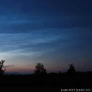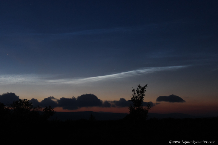 My first sighting of NLCs this season, and on a perfectly clear Summer Solstice, my friends and I watched NLCs form from the grounds of Beaghmore Stone Circles in Co. Tyrone, N. Ireland in perfect sky conditions and for others who where present at this ancient site it was their first experience of these mysterious clouds. They appeared soon after sunset, almost over head with silvery-blue bands, veil annd waves, type 4 brightness and even type 5, they vanished fast except for one trail glowing over the tree tops which looked indeed like meteor smoke.
