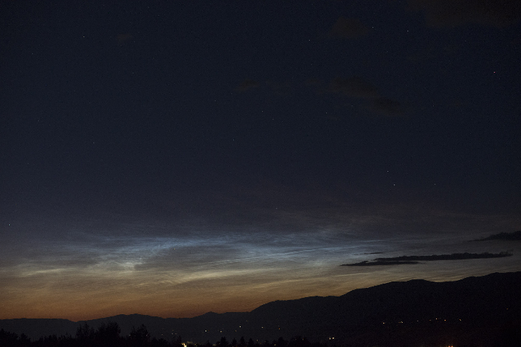 NLCs on northern horizon 1 hour and 40 minutes after sunset in Bozeman, Montana (45.67 deg north latitude). Nikon D800, 85 mm, f/3.5, 1/2 sec at ISO 2000.