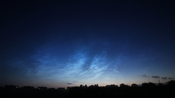 Really bright display of noctilucent clouds this evening. There was a curious dark gap between two bright parts of the display. The whole display featured many different and changing forms. One of the best I've seen to date.
