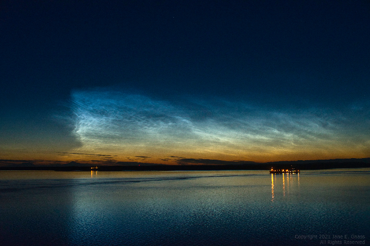 Captured at 2:33 a.m. from Point Woronzof, looking north across Knik Arm, Cook Inlet, towards Point MacKenzie. A cargo ship is leaving the Port of Anchorage just before high tide. This "Scirocco of Noctilucent Clouds" was dramatically bright and massively grouped, unlike the wispy NLCs I've seen in the past five years from Anchorage.
