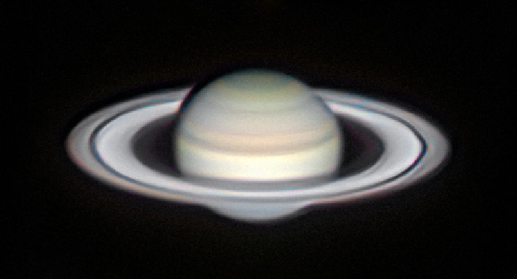 Saturn high in the evening sky. Imaged with a C-11 (5500mm) and ASI294MC. Stack of 12982 images.