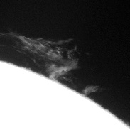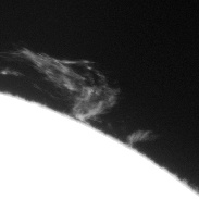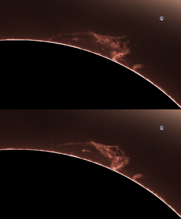 A beautiful large prominence on the Sun today... it was a fast mover too. The attached photos were taken 8 minutes apart, with an earth added to give a sense of the scale of the changes. This puppy was moving fast!