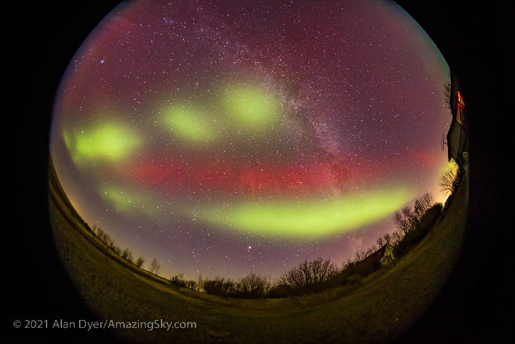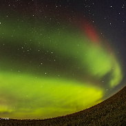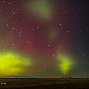 It was a busy night on October 11 for varied aurora phenomena, as the G2 aurora storm filled the sky with Northern Lights. This was from southern Alberta, where the display of curtains early in the evening showed horizontal "dune" structures, along with isolated blobs. Later, those blobs to the south were joined by a dim red SAR arc, invisible to the eye but the camera recorded it. A time-lapse shows it moving east to west.